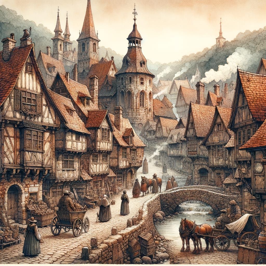 This image shows a detailed watercolor and ink drawing of a peaceful 17th-century European town with cobblestone streets, timbered houses, and a central medieval church.