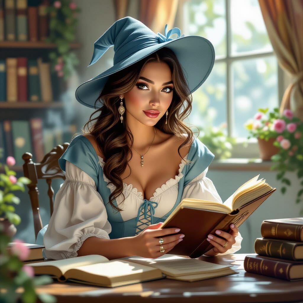 An elegant woman in a beige dress and blue hat, writing in a book with a blue quill. Features a refined, mysterious aesthetic with realism and fantasy elements.