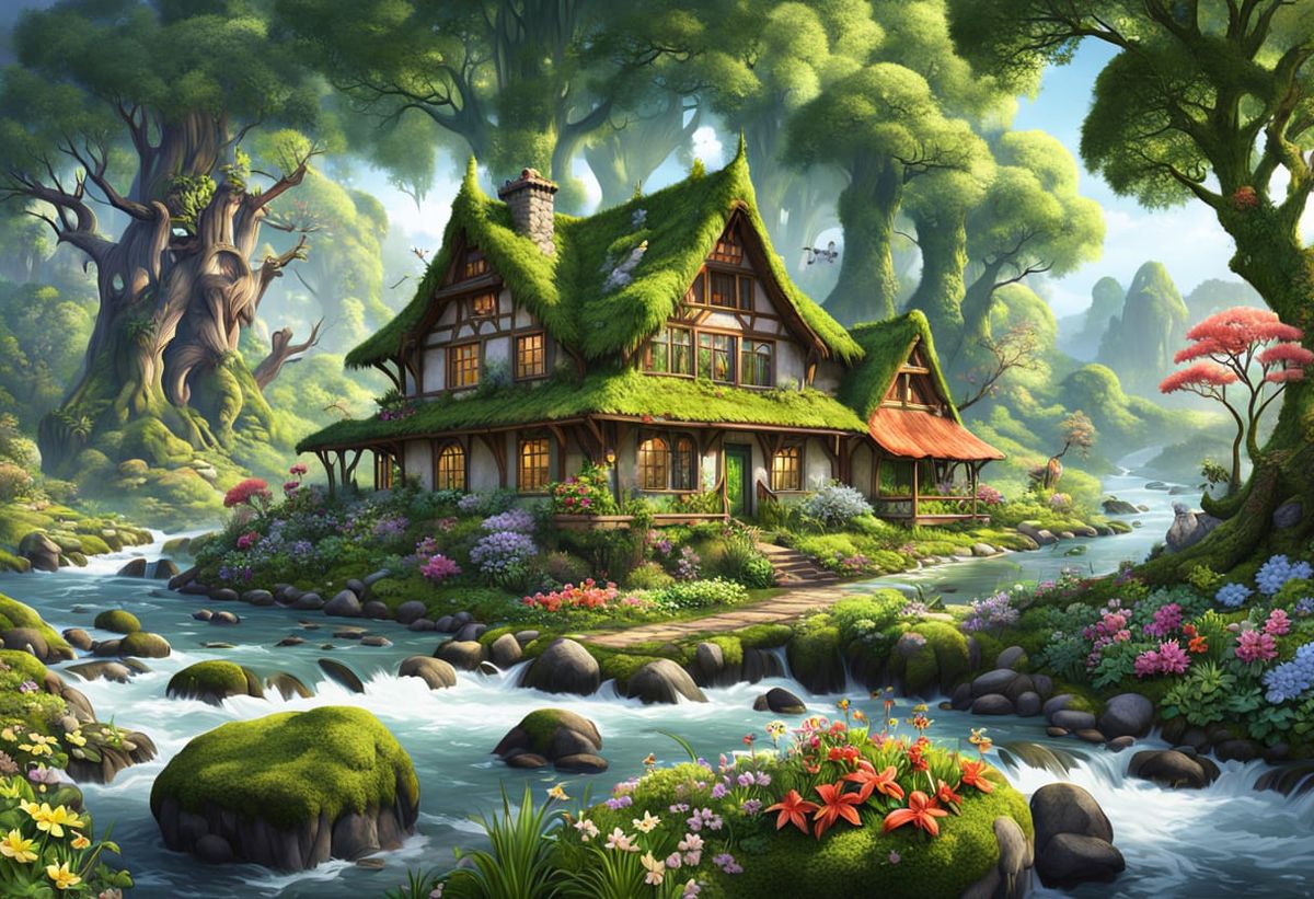 A vibrant image showing a river flowing through a forest with cottages. The scene includes colorful spring flowers, moss, ivy, and exotic animals in a highly detailed digital painting.