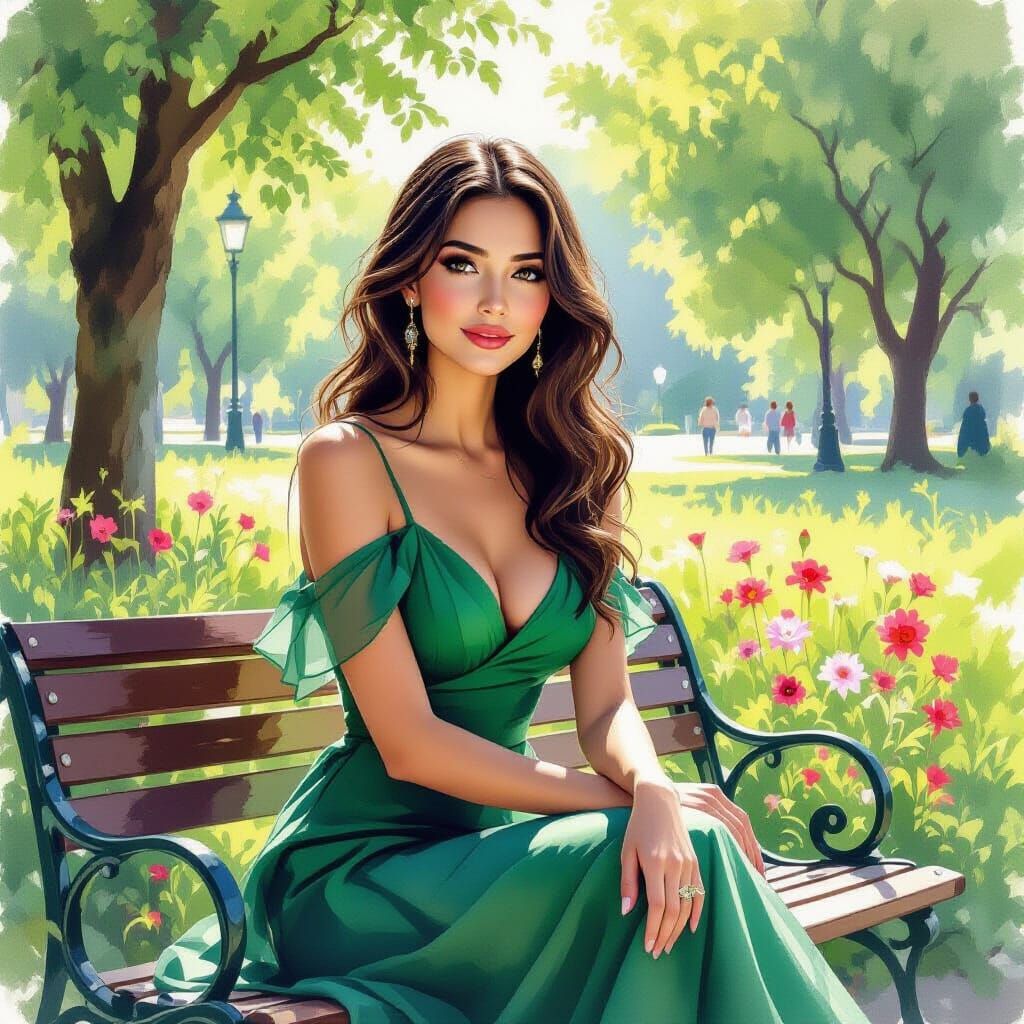 A beautiful woman in an emerald green dress sits in a serene park surrounded by lush trees and wildflowers. The image blends impressionistic and watercolor elements with vibrant colors, reminiscent of digital art.