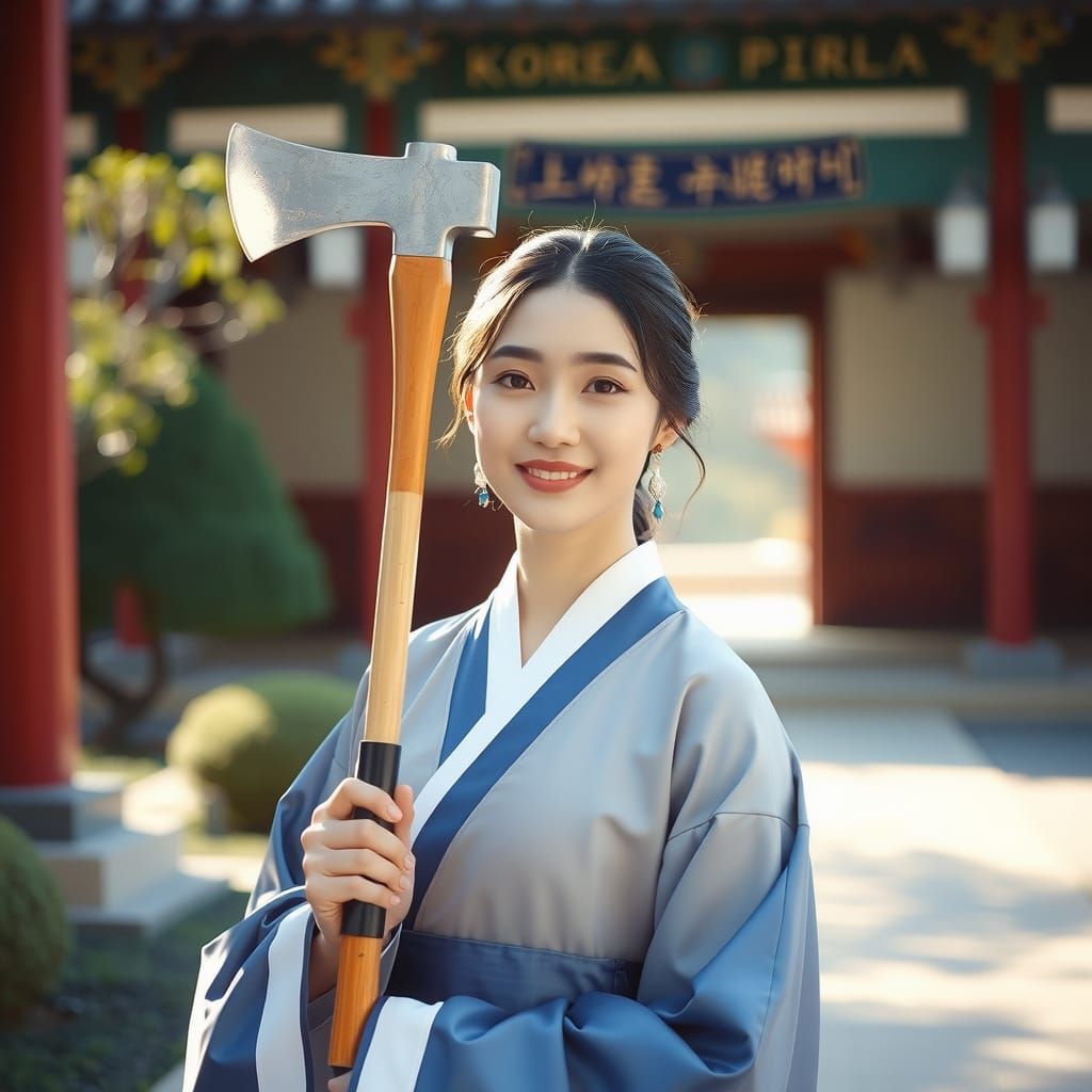 This image shows a Korean woman in traditional dress smiling gently. She holds an axe in a palace garden illuminated by soft sunlight, in the style of Kodak Portra 200 film.