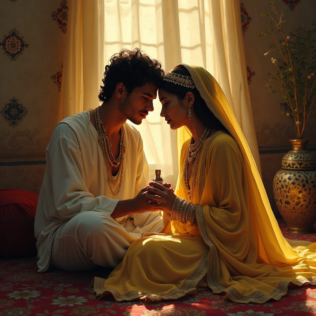 Uma pintura a Γ³leo em estilo hΓbrido de Jean-LΓ©on GΓ©rΓ΄me e EugΓ¨ne Delacroix. Eu um simple andarilho de 35 anos apaixonado e Uma linda mulher libanesa 25 anos protegida em um leito ornamentado com tecidos orientais, envolta por luz suave e sombras douradas. Seu perfume Γ‘rabe parece flutuar no ar, envolvendo ...