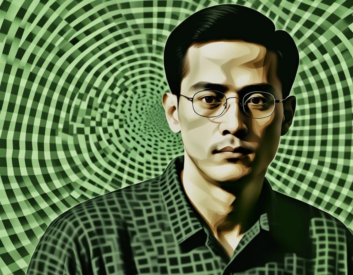 A digital artwork showing a man with a roughly sketched face. The monochromatic charcoal drawing features geometric patterns and spiral shapes in a soft, misty atmosphere.