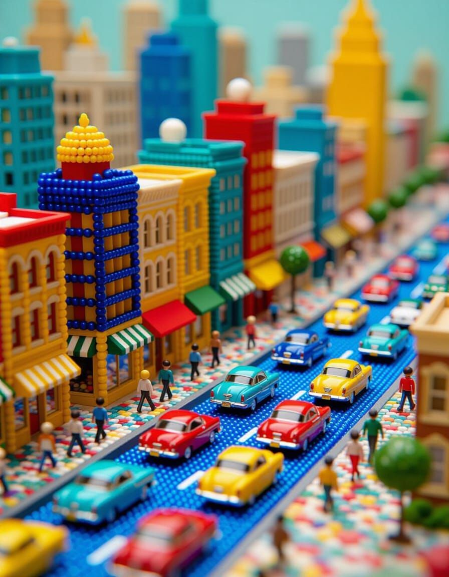 This image shows a colorful miniature city street diorama made from beads. The scene depicts beaded cars, buildings, and pedestrians in a vintage toy style with Art Deco flair.