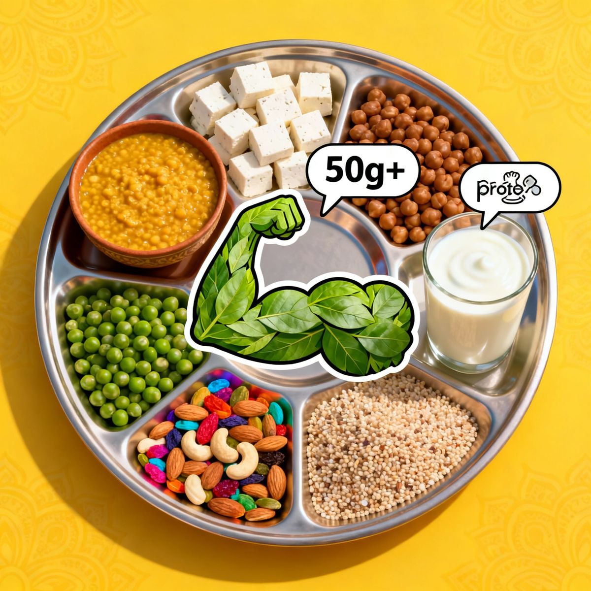 This flat design illustration features a colorful Indian thali with various dishes, including dal, paneer, and chickpeas. A green leaf bicep symbolizes plant-based power, with nutritional info in text bubbles.