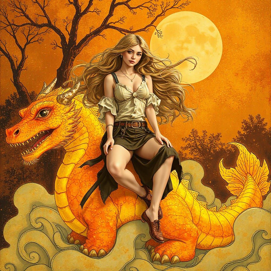 A serene woman with golden hair rides a giant gummy dragon through a sea of soda, featuring warm amber and tangerine colors, in a delicate linework style with art nouveau influences.