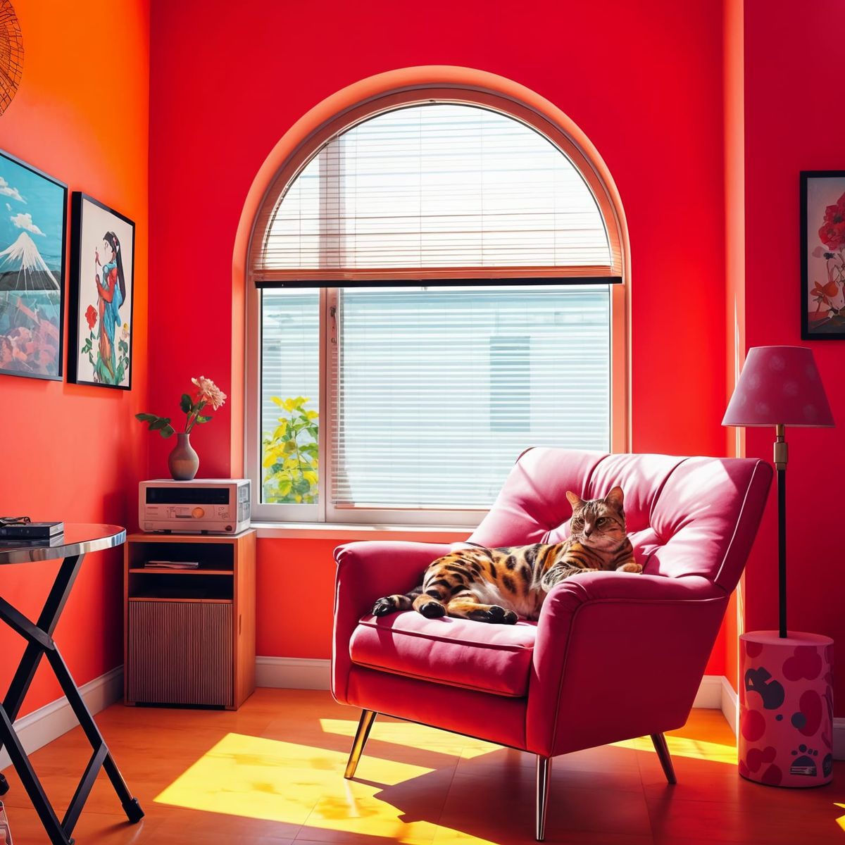 This image showcases a Bengal cat basking in sunlight on a postmodern armchair amidst a colorful, high-contrast craft office space with Japanese art prints and a unique barrel arch window.
