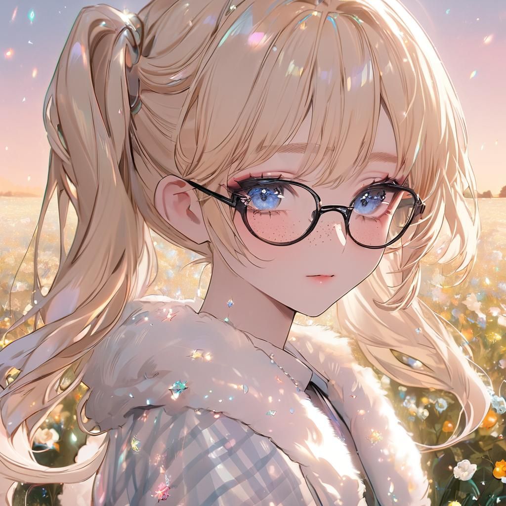 Masterpiece, best quality highest quality highly aesthetic beautiful anime girl with glittery blonde hair in two ponytails, soft tint, slight soft chromatic aberration effect, and dark blue eyes, gorgeous, charming appearance, glitter, extremely softly illustrated, makeup, soft, freckles, black glasses, ...