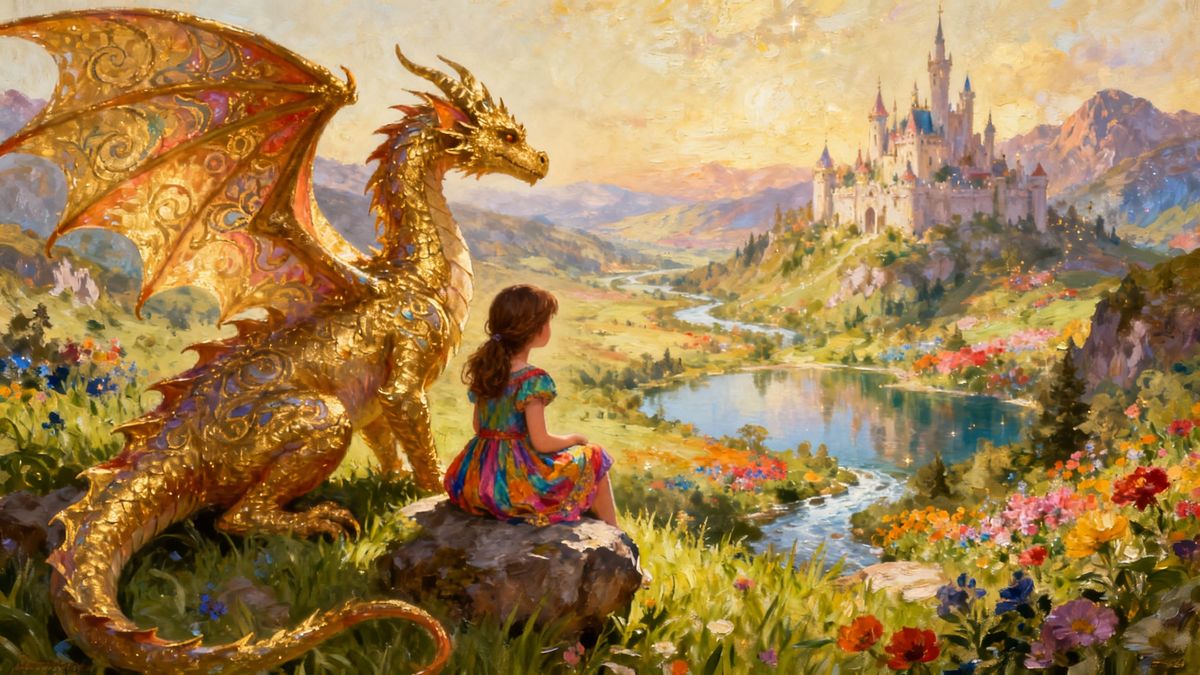 This oil painting depicts a girl in a colorful dress beside a large dragon, overlooking a fantasy valley with a river, lake, and castle. Rendered with intricate, golden detail.