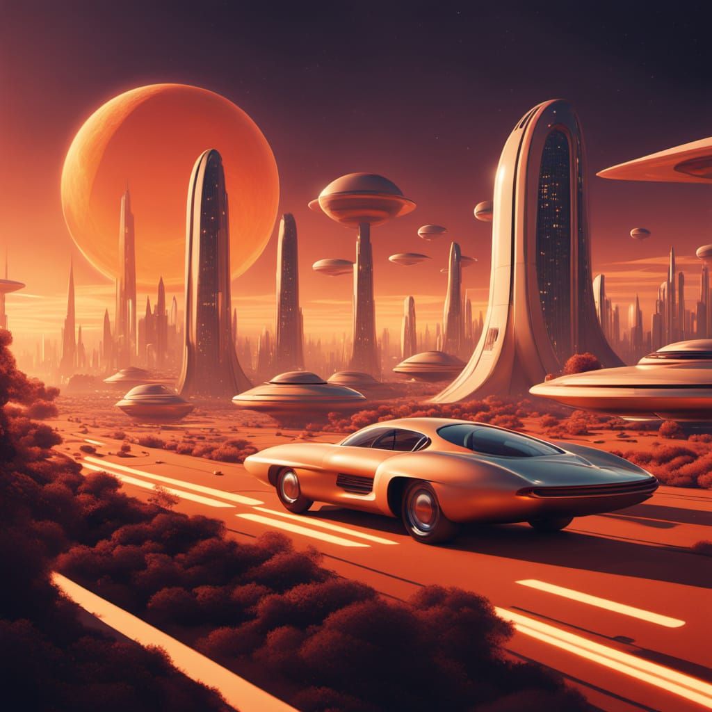 This image depicts a harmonious utopian cityscape with rounded buildings and sleek flying vehicles bathed in a warm orange glow, evoking a hopeful vintage future.