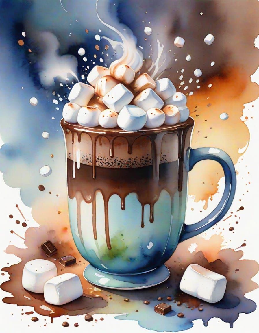 A watercolor splash art image of a mug filled with steaming hot chocolate and marshmallows. This cozy image evokes the warmth and sweetness of a winter treat.