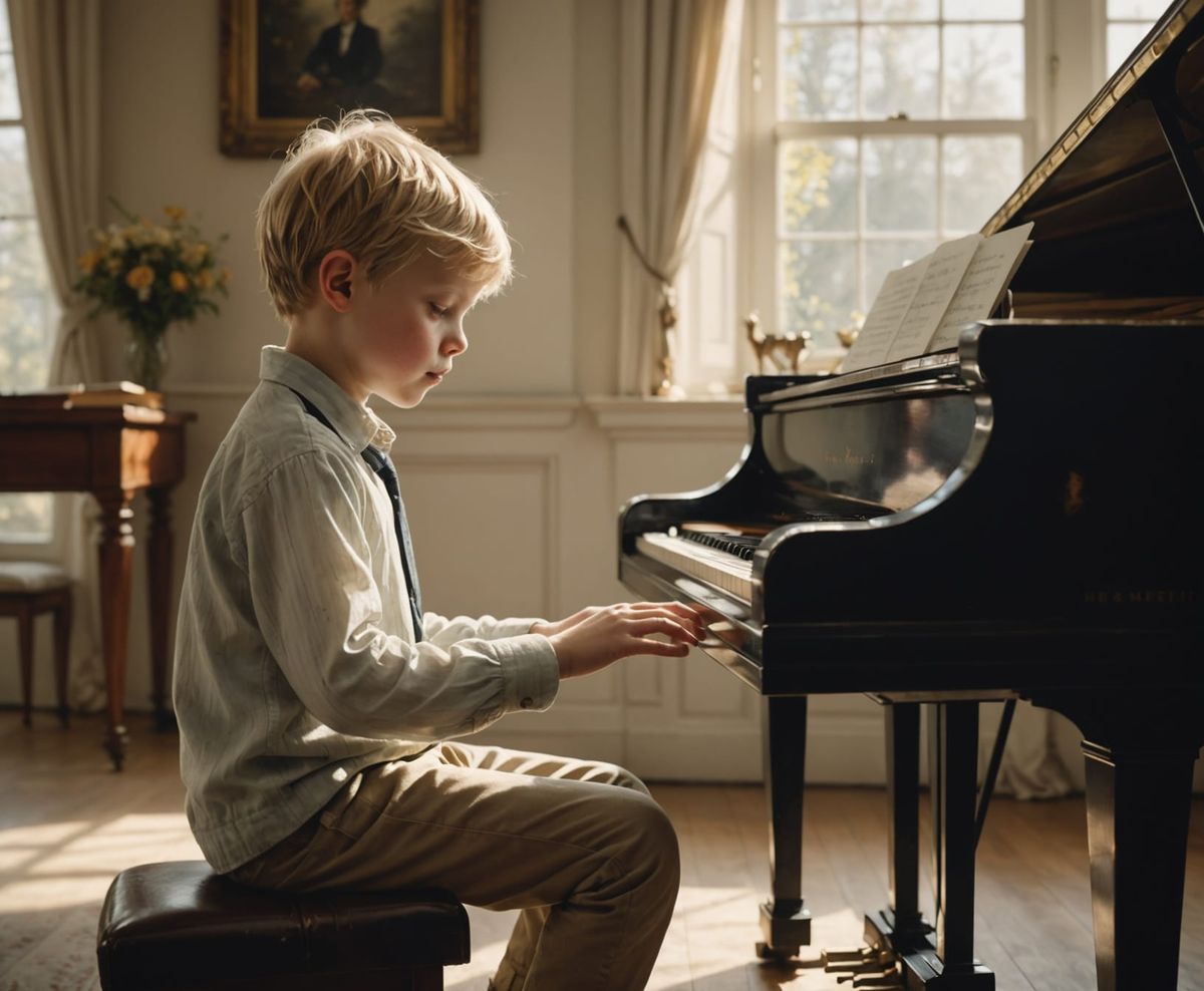 This image shows a young boy playing the piano in a bright, sunlit room. The artwork features delicate watercolor brushstrokes and a soft, diffused lighting for a dreamlike, evocative feel.