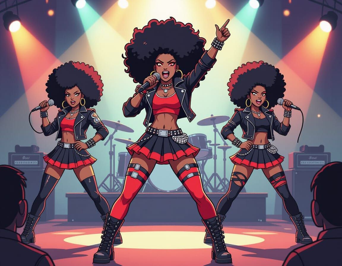 This image shows a J-metal band of three Black women performing on stage in a retro cartoon style. The group's punk aesthetic is emphasized by their clothing and powerful stances under bright spotlights.
