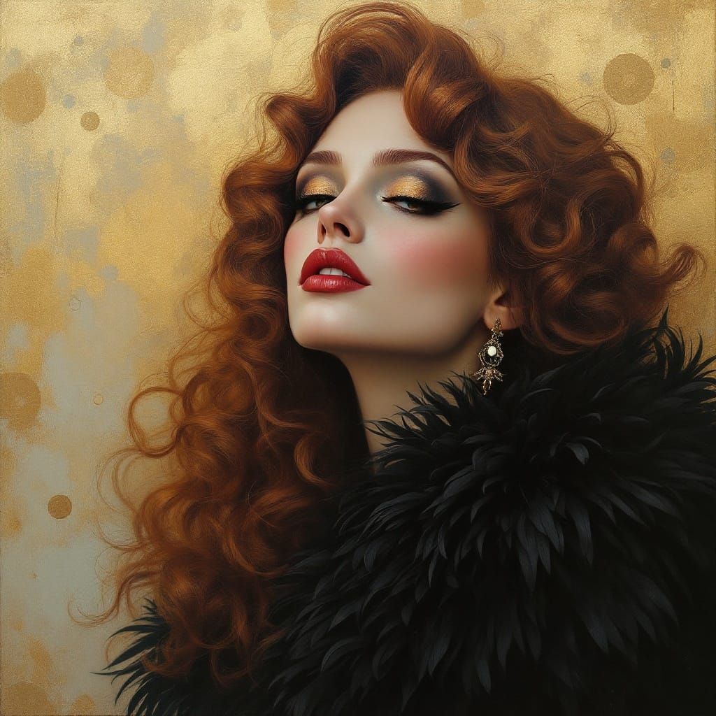 A digital painting of an elegant woman with auburn hair and a feathered boa. The artwork blends surreal, romantic, and abstract elements in a radiant and lyrical style.
