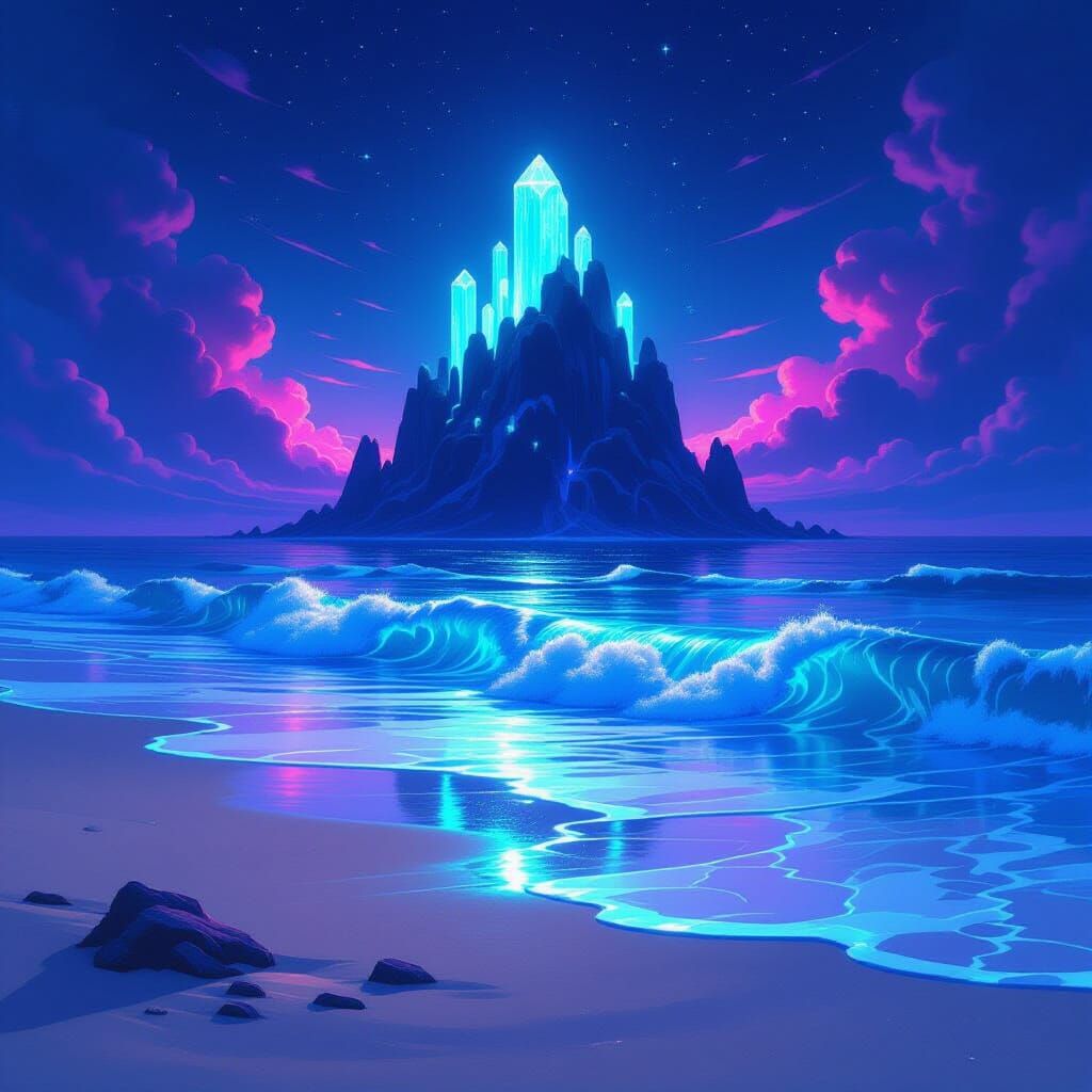 A digital painting of a crystalline island surrounded by glowing neon waves in turquoise, violet, and blue. The sands shimmer with luminous, ethereal textures and dramatic lighting.