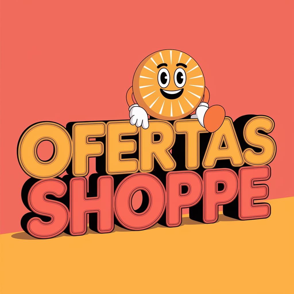 This image shows the word "Ofertas" in large, 3D yellow letters against a pastel purple background. Below it, the word "Shoppe" is written in smaller, 3D orange letters. A friendly lightning bolt character sits on the word "Ofertas", in cyberpunk style.