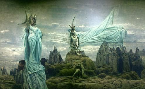 This image shows a Lovecraftian interpretation of the Statue of Liberty. The statue is presented in a dark, gothic style reminiscent of Gustave Doré's illustrations.