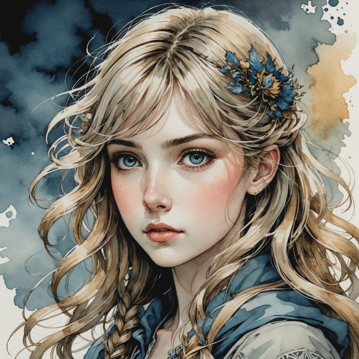 This image shows a blond girl with gray eyes, head and shoulders. The artwork is reminiscent of Arthur Rackham's style, combining watercolor and ink with anime influences for a colorful and detailed look.