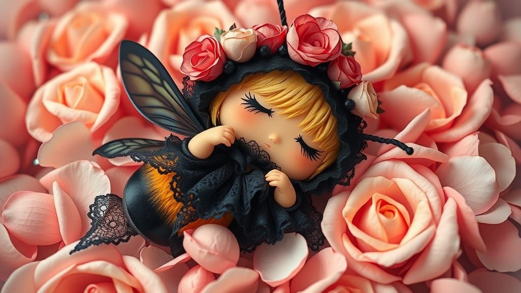 gothic-hippy chibi Sleepy Bumblebee laying in a bed of rose petals
