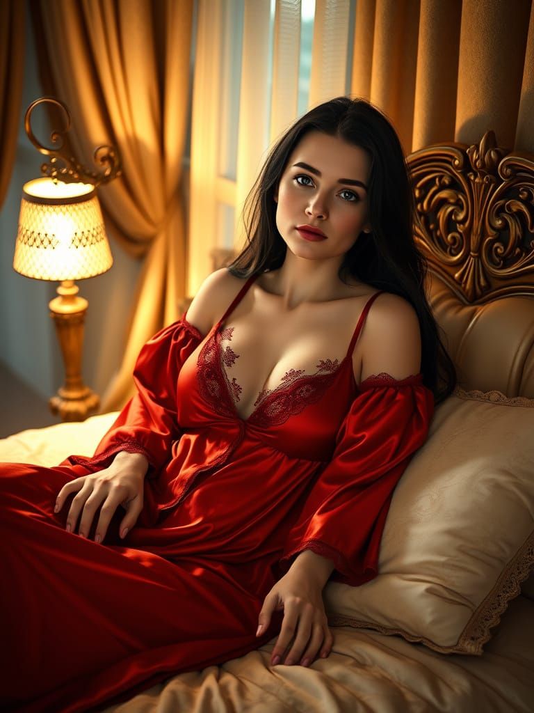 A close, elevated view of a woman in red satin sleepwear relaxing on a bed at night. The image features warm and cool lighting, ultra-detailed textures, and cinematic photorealism. The artwork is reminiscent of art nouveau.