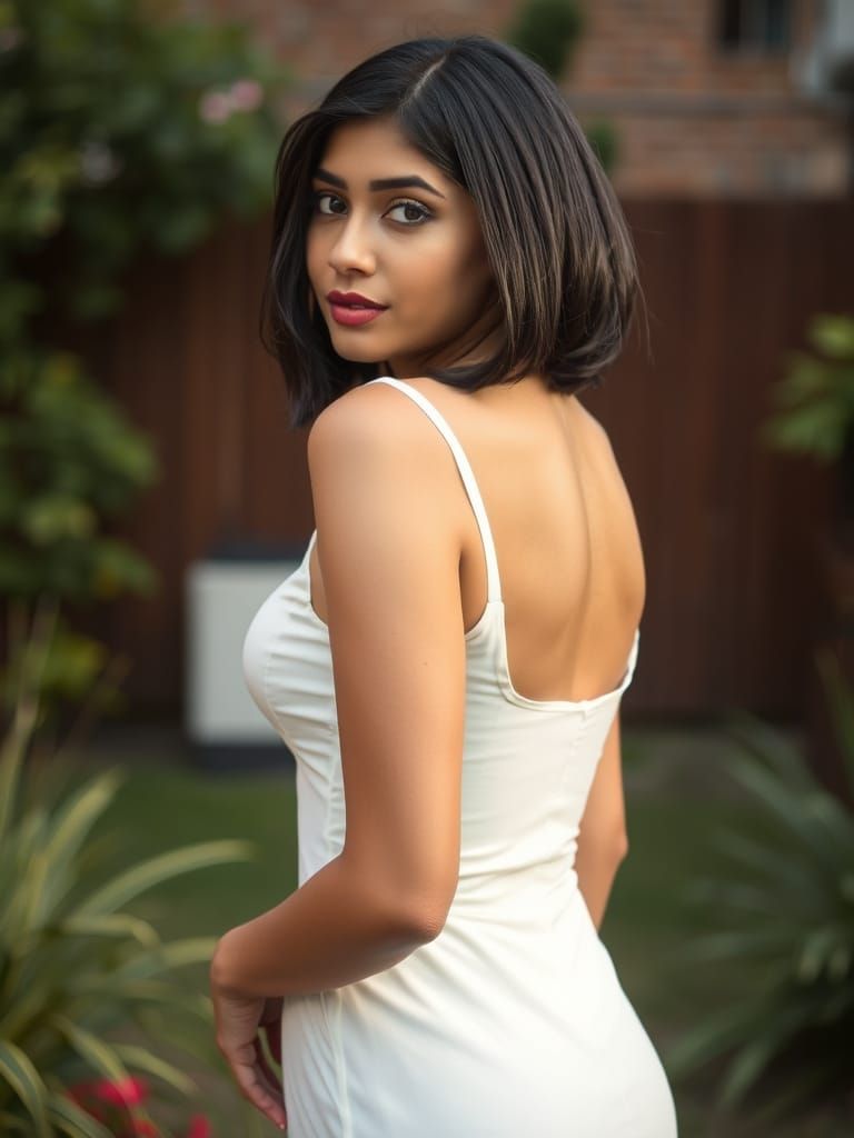 A captivating waist-up portrait of a young Pakistani woman with a bob haircut, wearing a white dress and looking sensually over her shoulder.