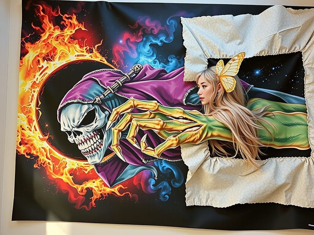 This image shows a woman in a white dress gazing at a framed portrait of a menacing, Grim Reaper-like figure. The figure has a cosmic nebula veil, glowing skin, and fiery halo in a men's bedroom.