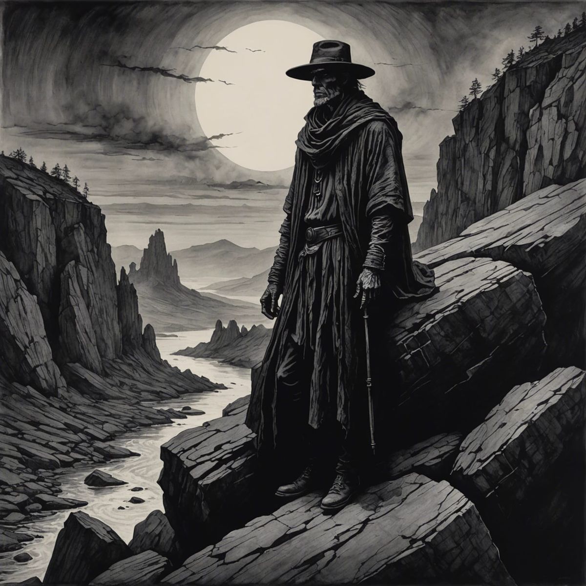 This image shows an enigmatic figure drawn in pen and ink. The figure sits on a rock, is cloaked in shadow and wears an imposing hat, creating an eerie atmosphere.
