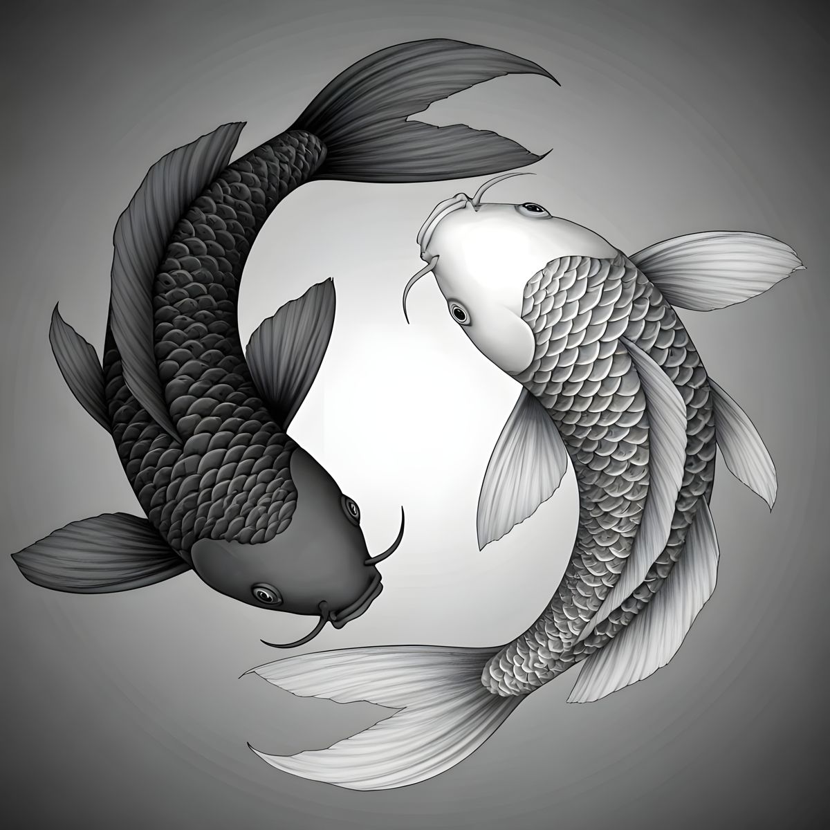 This image shows two black and white koi fish in the shape of the yin and yang symbol, created as a detailed pencil drawing.