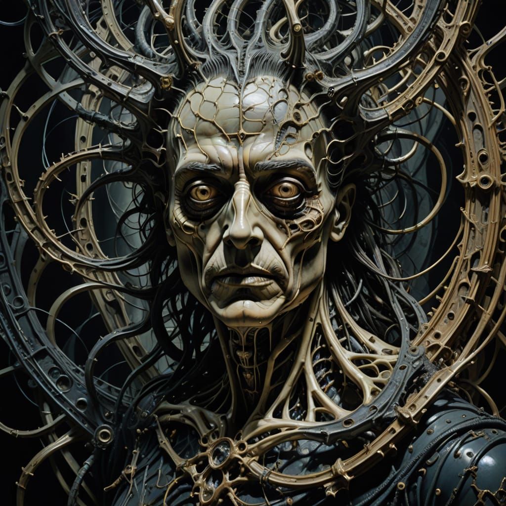 This dreamlike vision showcases abstracted forms interacting in a chaotic space, rendered as a surreal oil painting with delicate metallic threads and organic shapes.