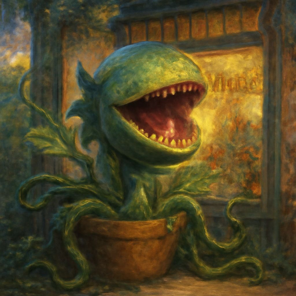A vibrant image of a man-eating plant reminiscent of Little Shop of Horrors. This piece evokes a painterly style, blending oil and ink techniques to bring the monstrous plant to life.