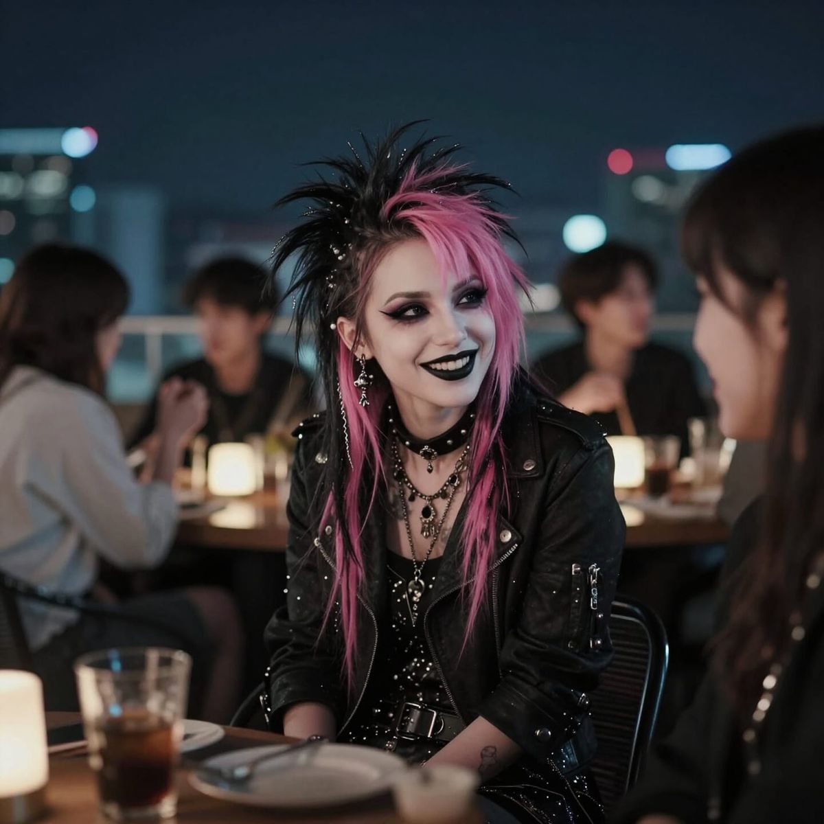 This cinematic image captures a smiling punk girl with vibrant pink hair at a rooftop restaurant. It features dramatic lighting and film grain for an atmospheric feel.