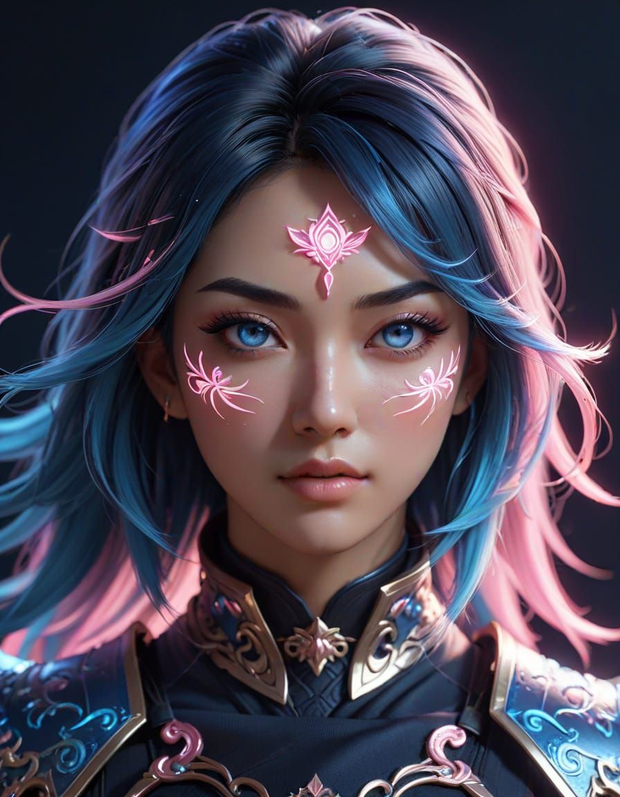 A stunning close-up portrait of a young South Asian warrior goddess, blending traditional elegance with supernatural allure and neon accents, set against a soft pastel backdrop