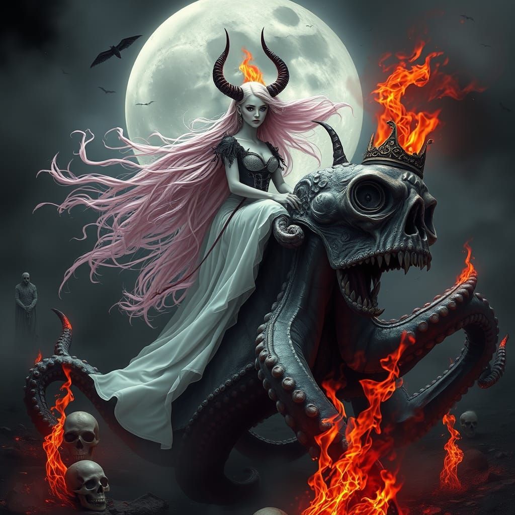 This image shows a gothic princess with pink hair riding an octopus in a dark desert. The surreal scene includes flames, skulls and melting crystals, with dark, sinister and gothic medieval elements.