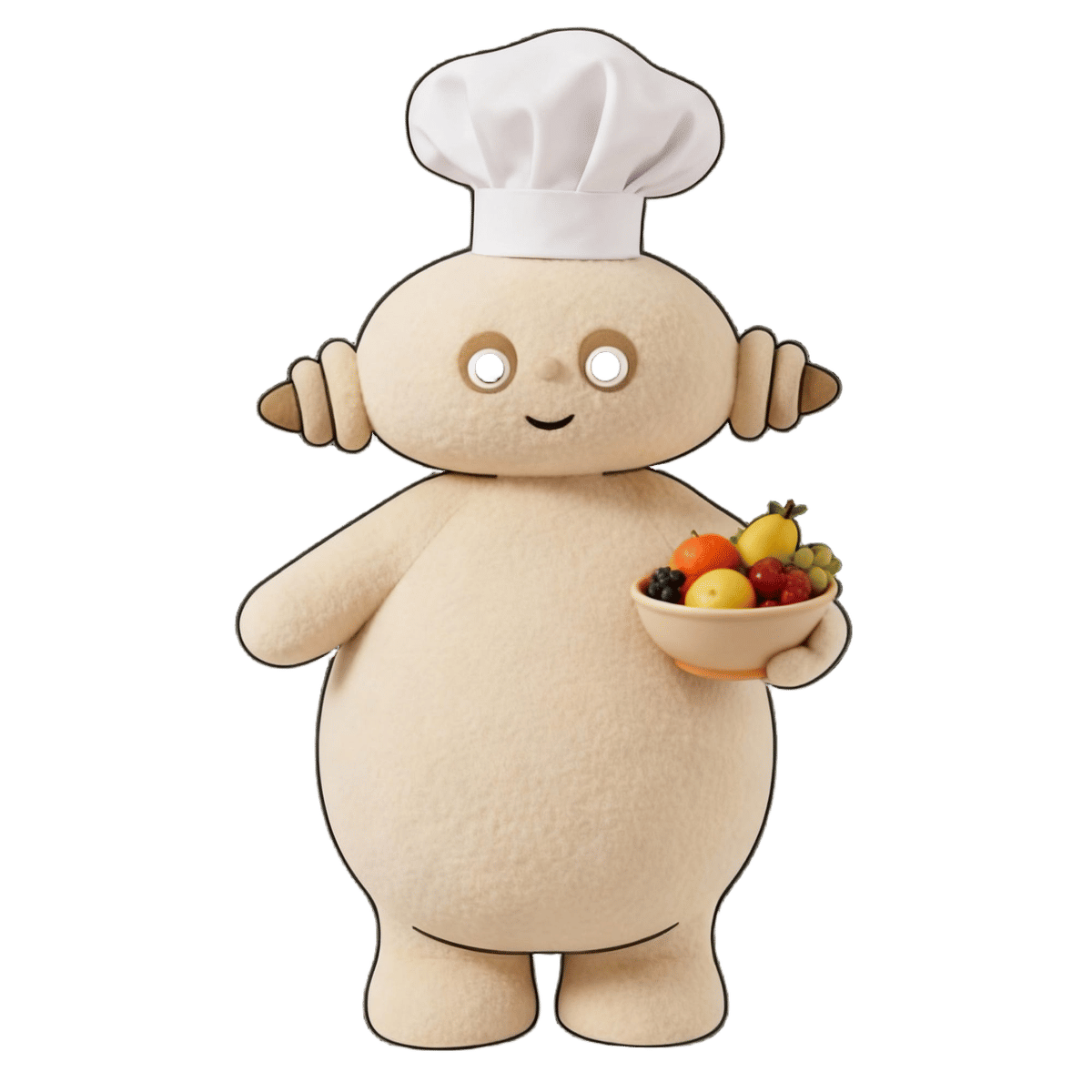 This AI-generated image depicts a character wearing a chef hat and holding a bowl filled with various fruits. The character is accurately rendered with the added culinary accessories.
