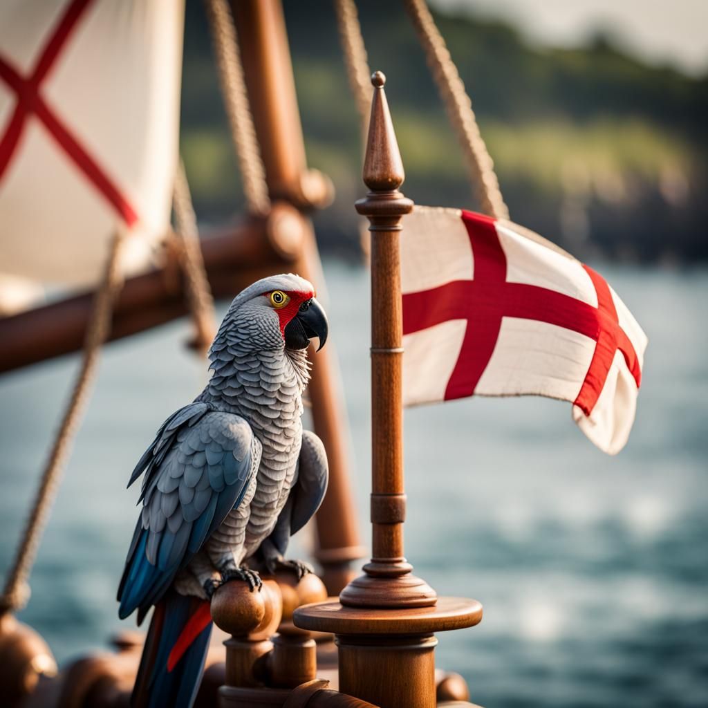 This image shows an English sailing ship on a medieval ocean voyage. The photograph highlights the English flag, warriors, captain, parrot, and cannon with natural lighting and sharp focus.