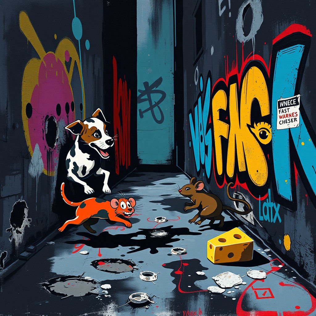 This image shows a vibrant street art scene in a dimly lit alley. The artwork, in a graffiti style, depicts a dog chasing a cat, which chases a mouse, which chases cheese.