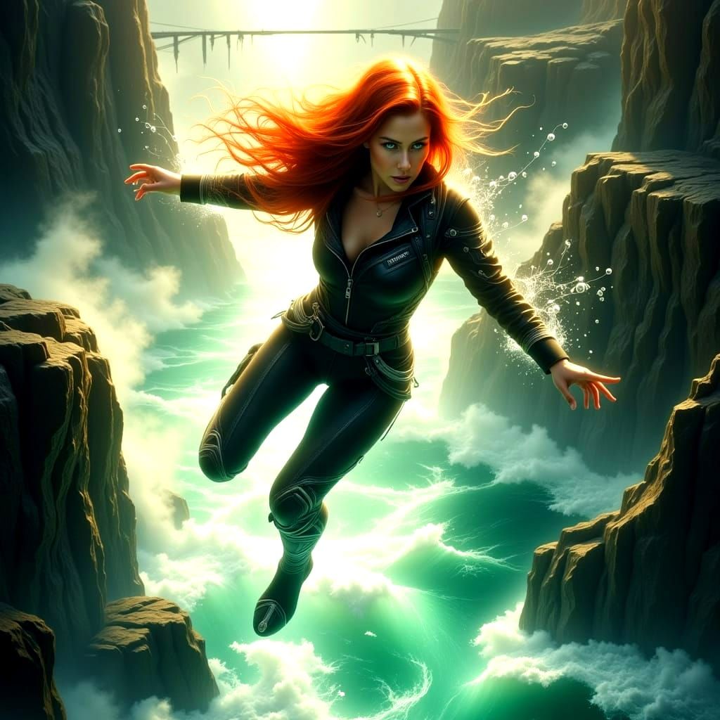 A stunning, hyperrealistic depiction of a fearless, auburn-haired woman in mid-air, surrounded by dappled light and energetic orbs as she leaps from a high bridge towards a beautiful landscape and fast-flowing river below.