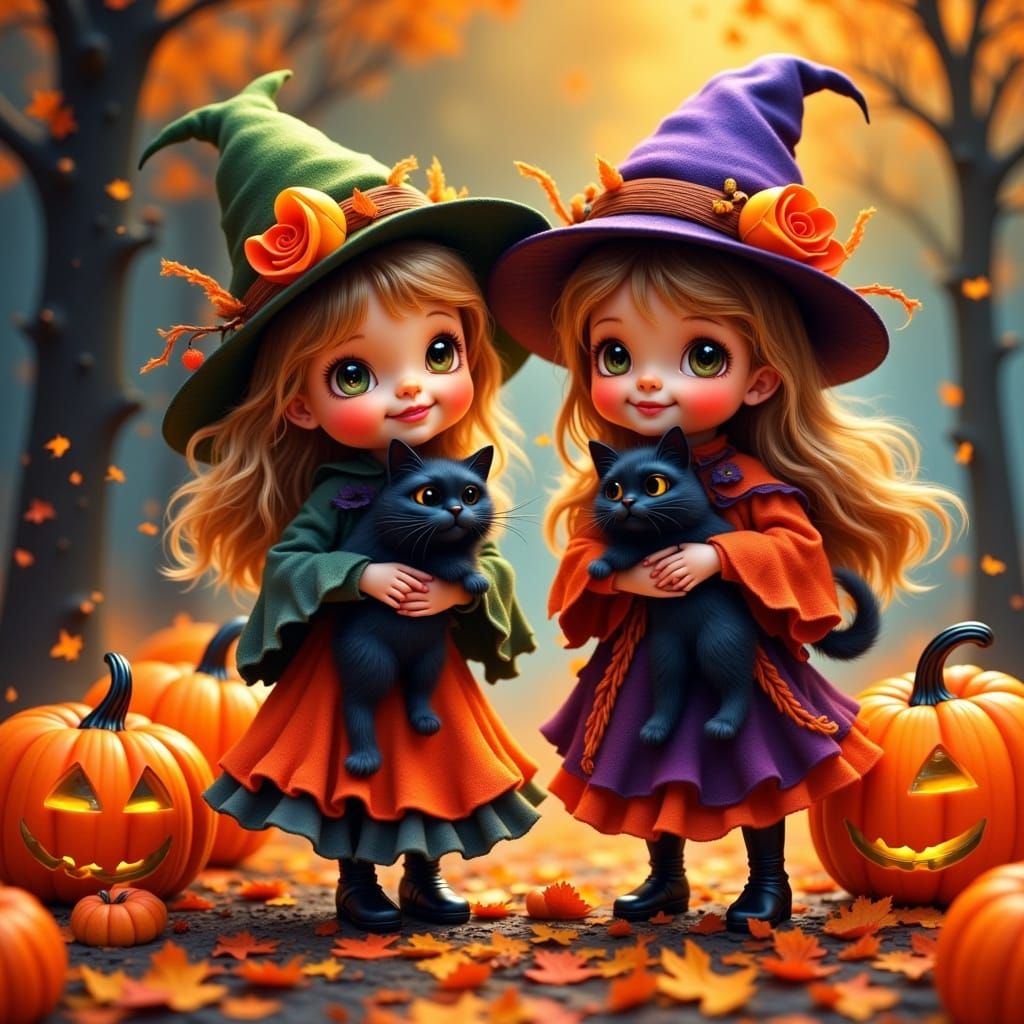 This image shows two adorable young girls in vibrant Halloween outfits, holding their fluffy black cats. Rendered in a charming fairytale illustration style with soft, glowing light and autumn colors.