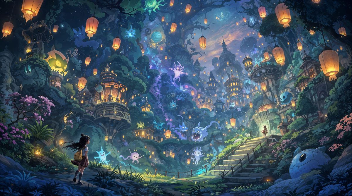 This enchanting digital painting captures a young girl's journey through a mystical realm, filled with fantastical landscapes, whimsical creatures, and a sense of wonder, all brought to life in a soft, painterly style reminiscent of Ghibli's signature aesthetic.