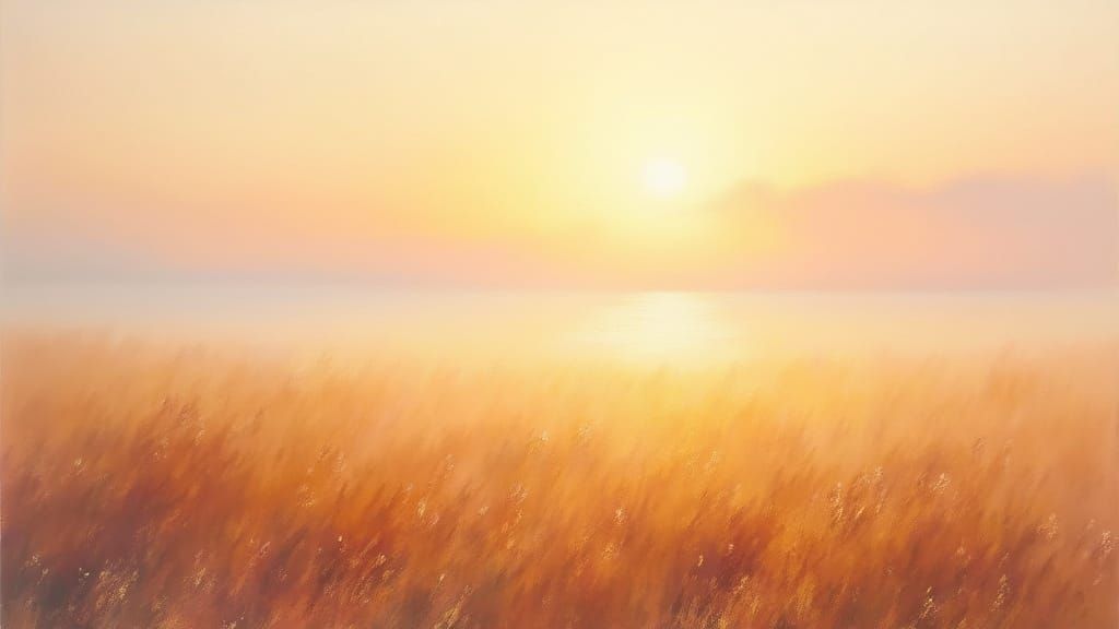 This image captures a serene and peaceful moment, blending warm hues of sunset over a serene landscape, with gentle textures and gradient color shifts, evoking a dreamy and emotive quality reminiscent of Impressionist art.
