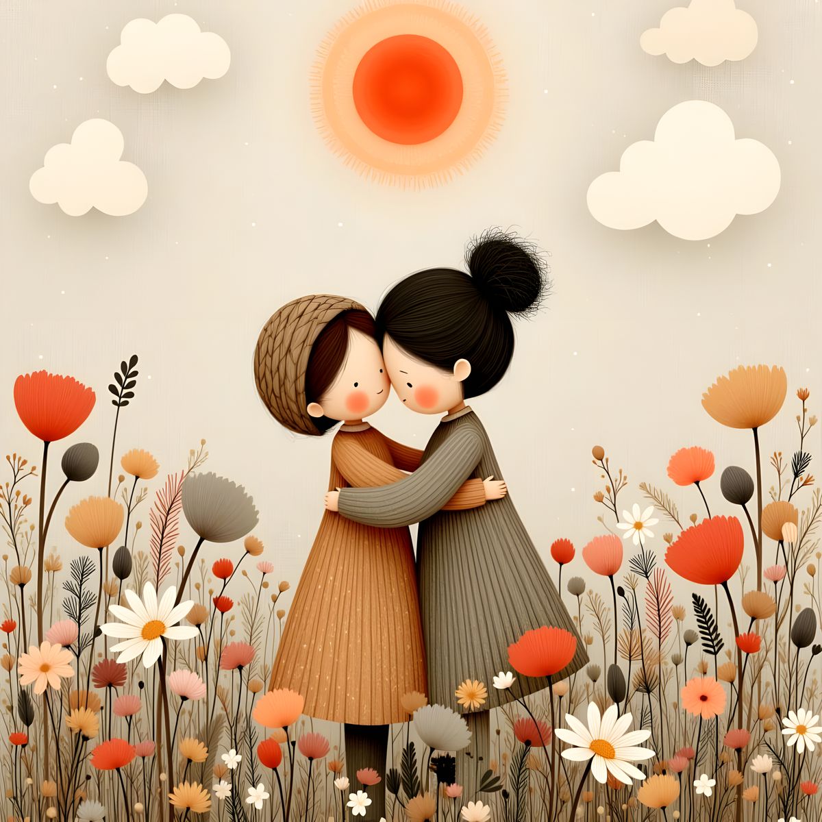 This image shows a vintage folk art Chibi Anime style drawing of a shy Tibetan girl hugging a happy Kashmiri boy in a flowery field with a radiant sun and pastel colors.