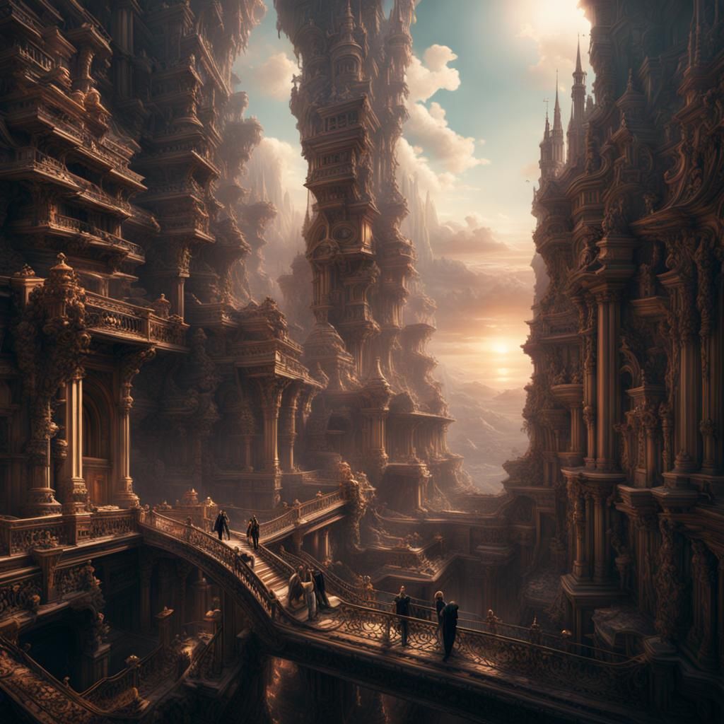 A digital matte painting of a dramatic and intricately detailed scene. The image showcases a maximalist aesthetic with a cinematic and atmospheric quality.