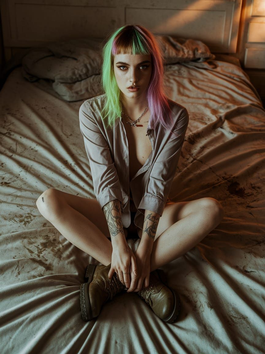 This image captures a striking young woman with an asymmetrical haircut and numerous tattoos, sitting on a messy bed with a torn blouse and army boots, set in warm, soft lighting with gentle shadows