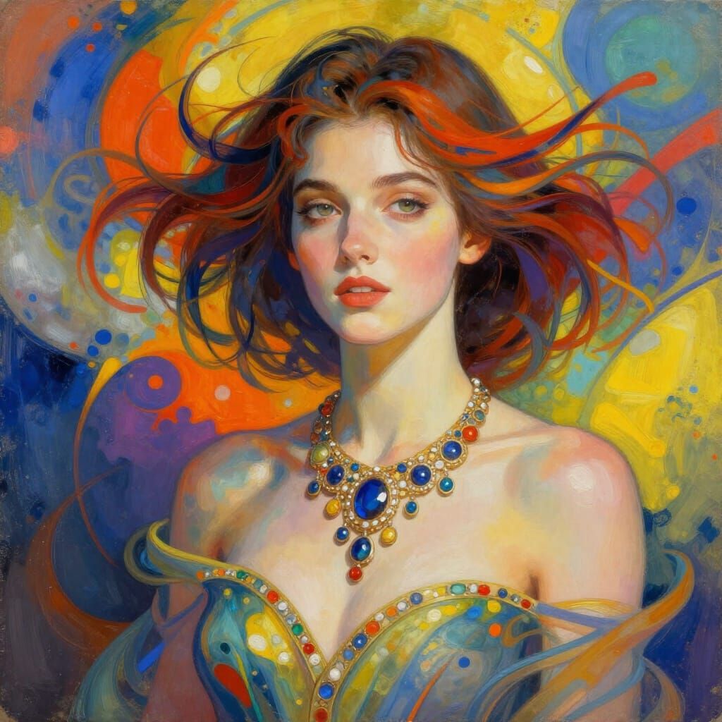 This image features a beautiful woman with a serene expression, adorned with a jeweled necklace. The artwork uses vivid colors and dynamic lighting in a high-resolution digital art style.