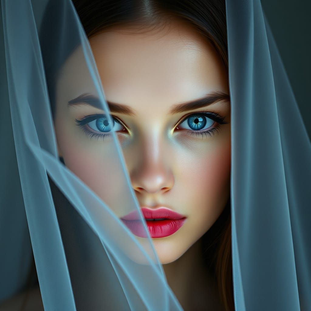 A monochrome swedish female portrait with light tan skin and long shiny dark hair, vivid fluo glossy pink lips as the only colored element, intense cobalt dark blue sparkling cat's eyes, direct symmetrical gaze, smooth high-definition skin, soft texture detailing. grey tulle veil stretched taut in ...