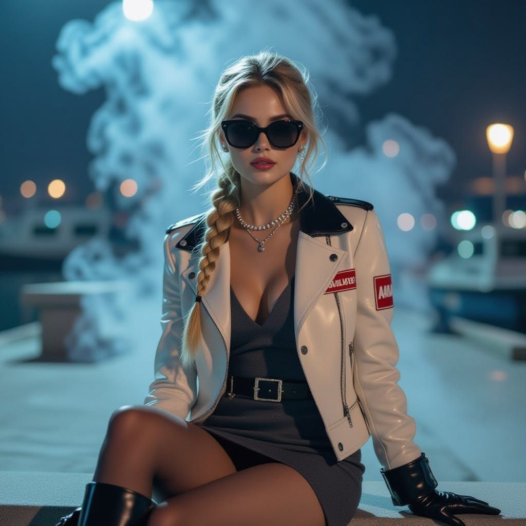 This image captures a hyperrealistic, colorful glampunk portrait of a blonde actress with braided hair. She's styled in a sheath dress and vintage racing jacket, seated in a foggy port at night, illuminated by dramatic cinematic lighting.