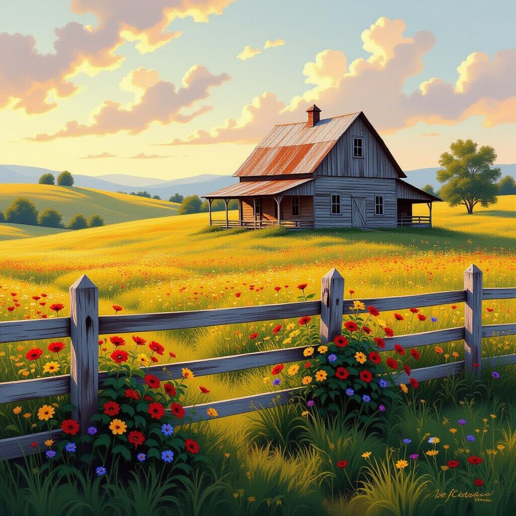This image shows a charming farmhouse with wildflowers by a wooden fence, bathed in warm golden hour light. It evokes nostalgic storytelling with a painterly texture.