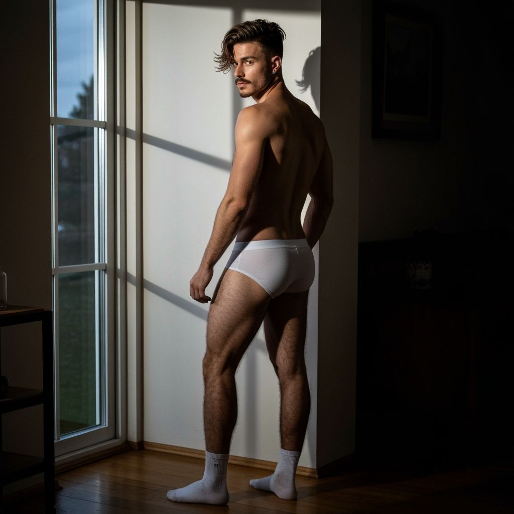 This image shows a full-body portrait of a masculine man in an old, elegant house bathed in moonlight. Dramatic light and shadow create a moody atmosphere.