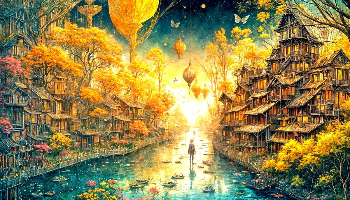 This stunning watercolor depicts a vibrant paradise world filled with galaxies, rivers, and sparkling golden trees. Butterflies flutter in the distance of this hyperdetailed, maximalist scene.