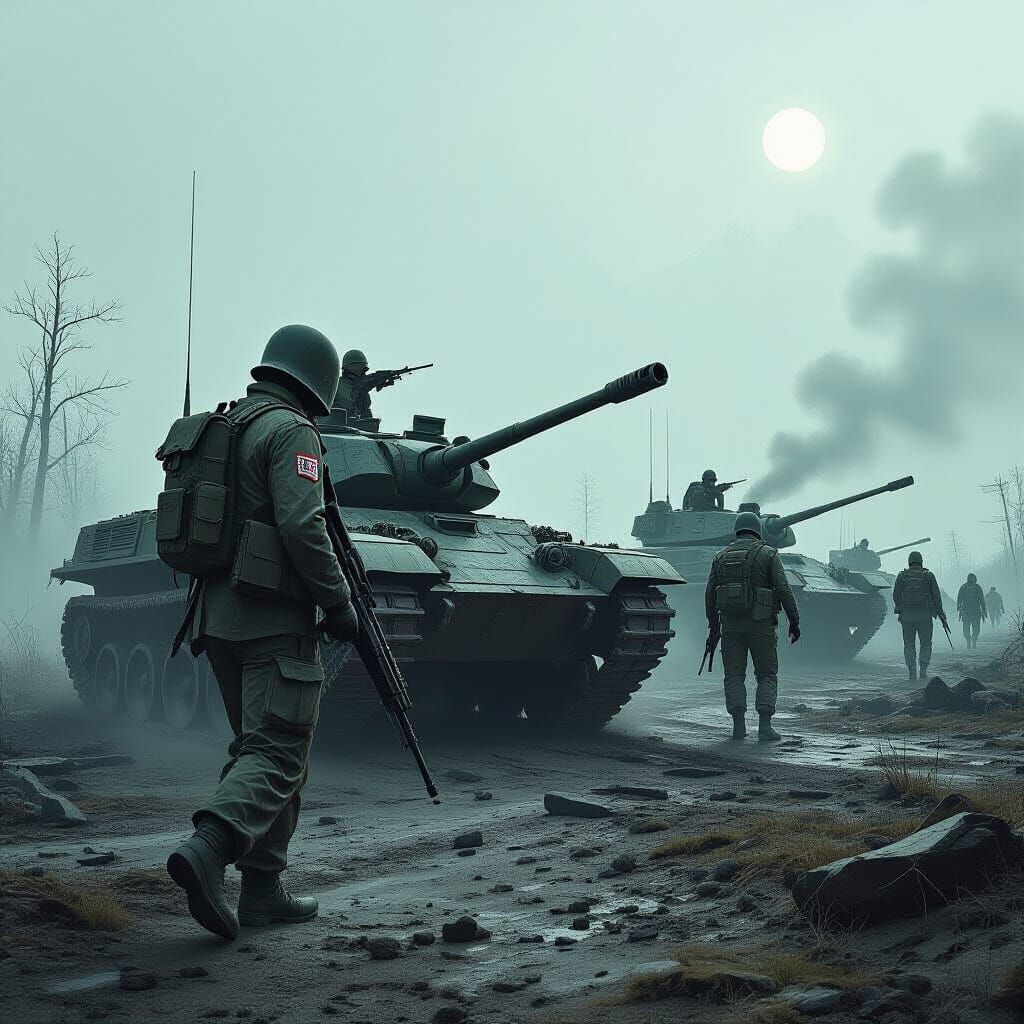 This image shows a zombie squad in torn military uniforms defeating tanks and soldiers amidst a desolate, post-apocalyptic setting. The artwork displays a dark realism with futuristic and haunting surreal elements.